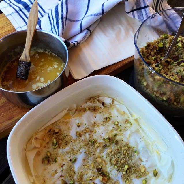 Verser le sirop tiède sur la baklawa dès sa sortie du four.